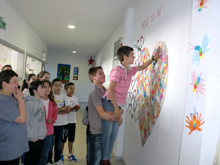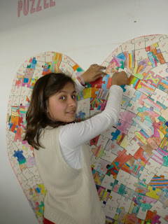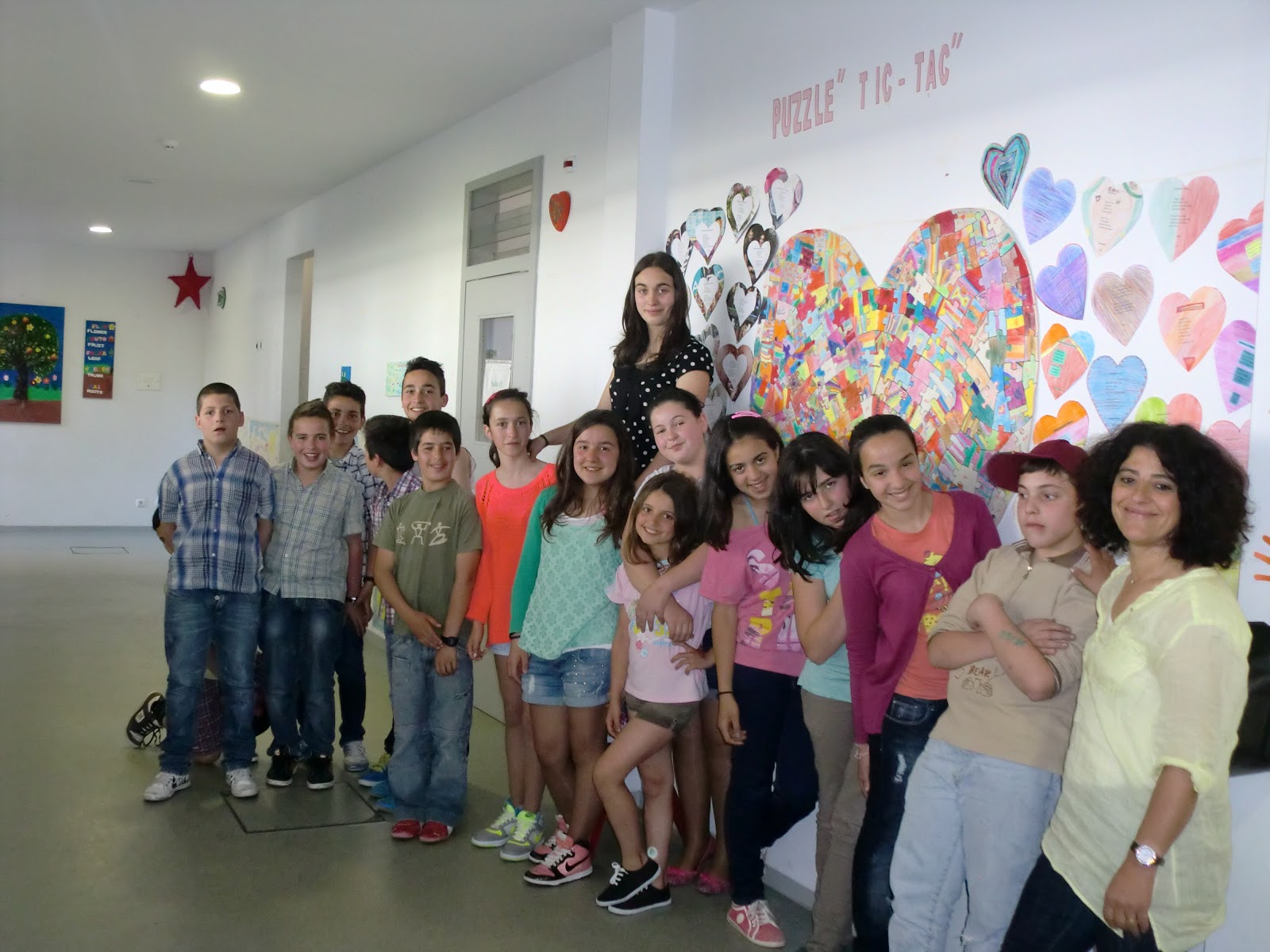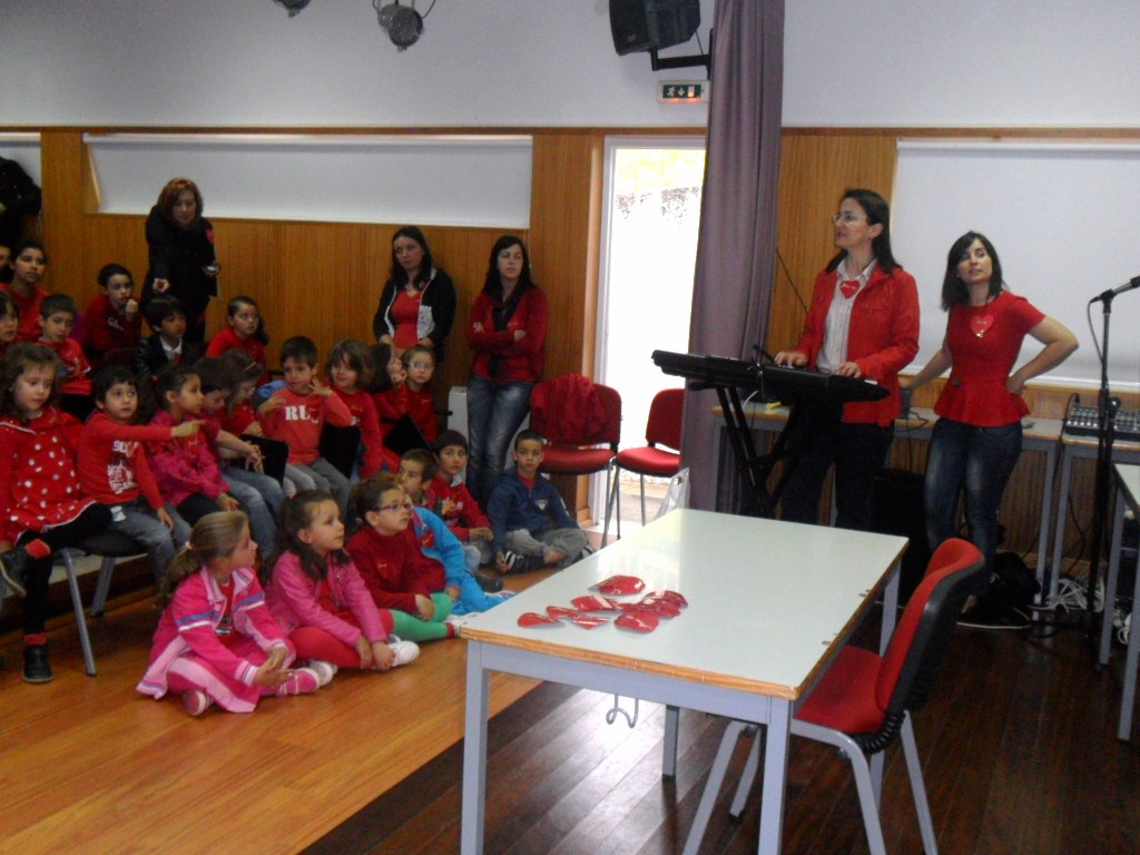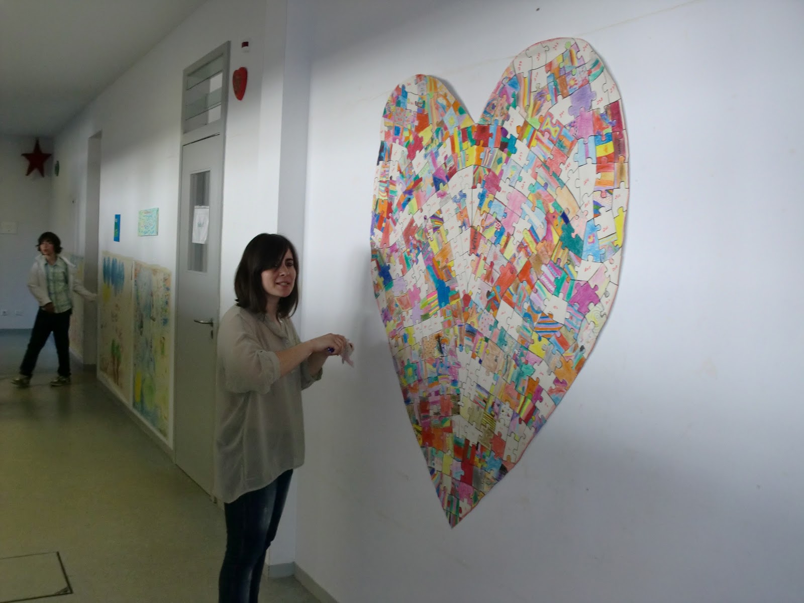 Auxiliando as comemorações do mês do coração e estabelecendo articulações com os parceiros educativos, a equipa da BE promoveu uma espécie de jogo articulado, a construção de um puzzle grande, tendo por base um coração. Este estava cortado em 325 peças em forma de puzzle. Deste modo, cada aluno desde o pré-escolar até ao 2ºciclo, docentes, funcionárias e membros da comunidade pintou e colou a sua peça no coração, depois de descobrir a posição da sua peça no puzzle. Foi uma atividade muito engraçada, inovadora e apelativa para todos. Presenciou-se, para nosso agrado, a surpresa de todos diante o puzzle e a forma como se juntou o útil ao agradável, promovendo-se o envolvimento de todos numa problemática muito desenvolvida na sociedade, cativando-os e desafiando-os à descoberta do produto final – o coração da ESCOLA, recheado com um pedacinho de cada um.